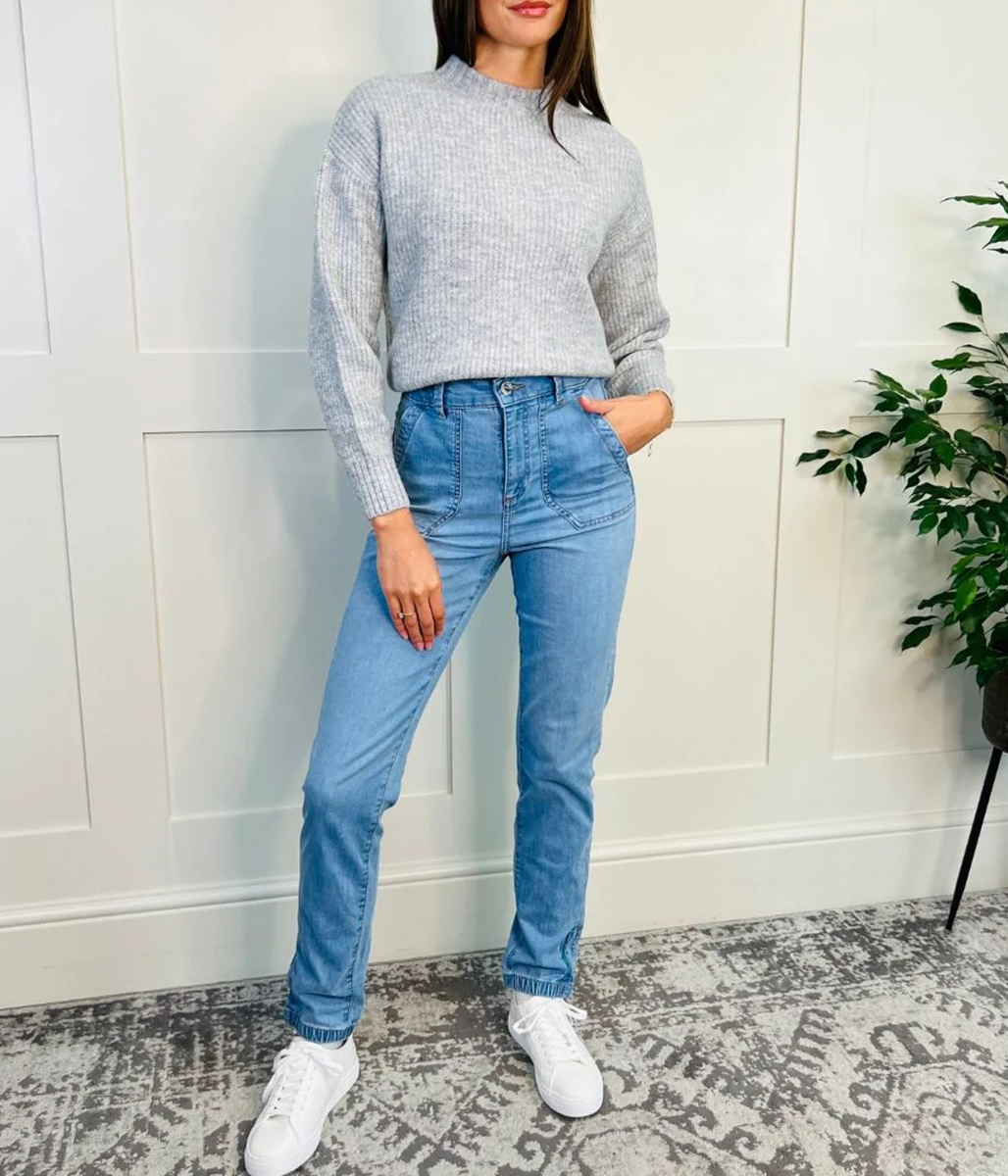 Elevate your casualwear with these cotton-rich denim joggers. They're cut to a flattering slim fit, with elasticated ankle-grazer hems for a sports-luxe feel. The high waist is complete with a neat button and zip fastening. Made from soft, stretchy fabric that's washed for an authentic look.